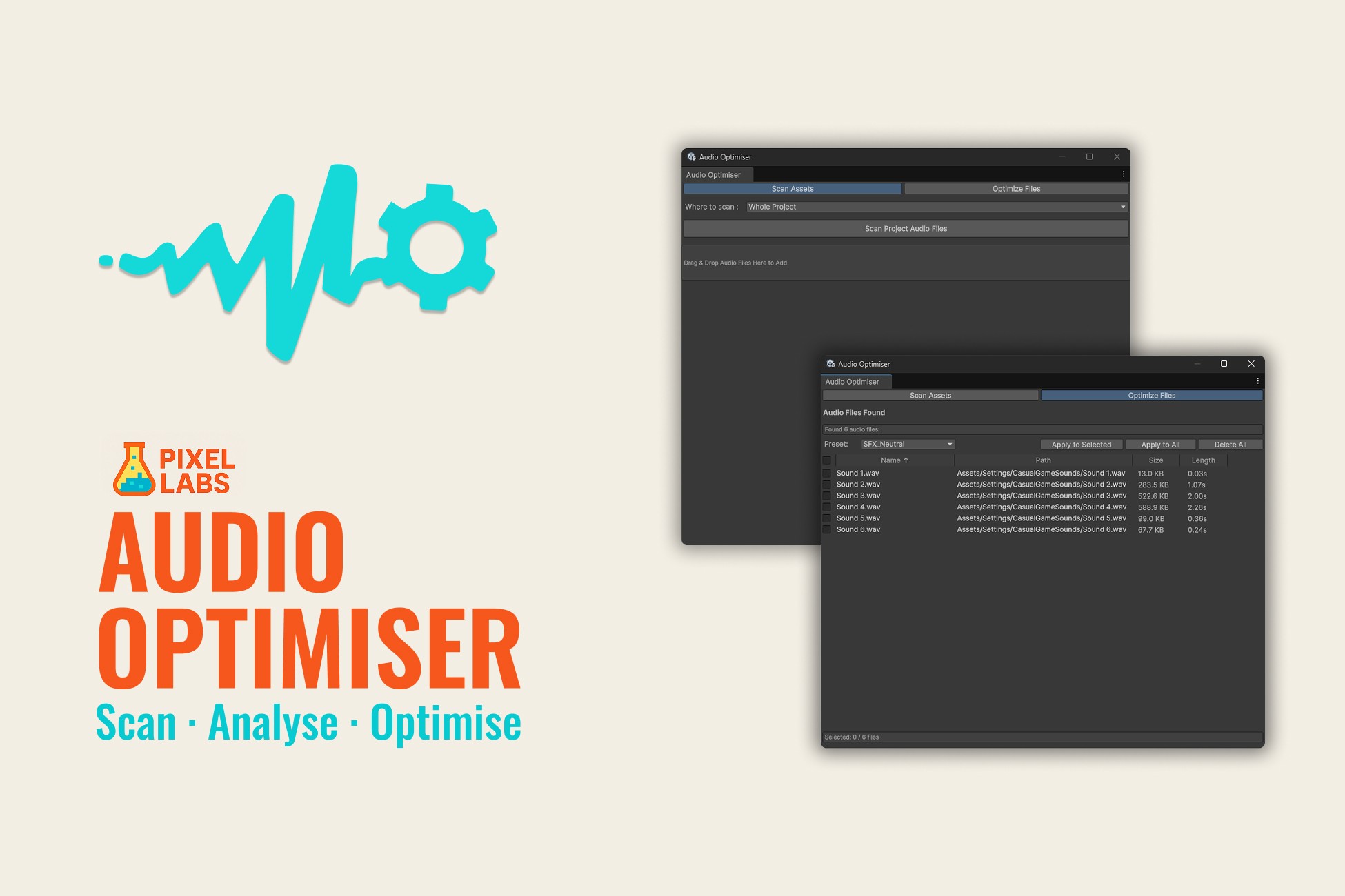 Audio Optimiser lets you batch optimise SFX and BGM using presets or custom settings, reducing build size and improving performance without losing quality saving hours of manual work.